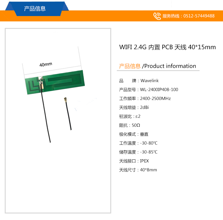 WiFi 2.4G 內(nèi)置PCB天線 40*8MM IPEX接頭